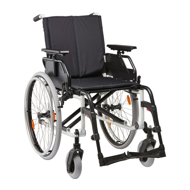 Regolabili in altezza Sezioni laterali orientabili all'indietro Lunghezza gambe regolabile con incrementi di 15 mm da 42 a 51 cm Poggiagambe orientabili lateralmente/rimuovibili Piastre piedi regolabili in altezza e ad angolo con cinturino per tallone Freno di stazionamento/freno a tamburo (a seconda della versione) Ruota motrice in PU da 24", incl. asse a sgancio rapido, ruota piana in PU da 7", asse passante, ruota piana in PU da 7". perno passante, ruota PU da 7"